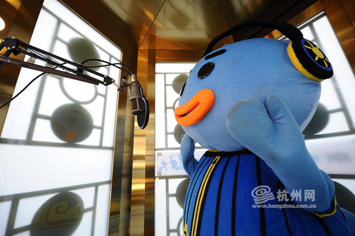 一位市民打扮成一只萌萌的卡通形象,走進錄音棚朗讀。