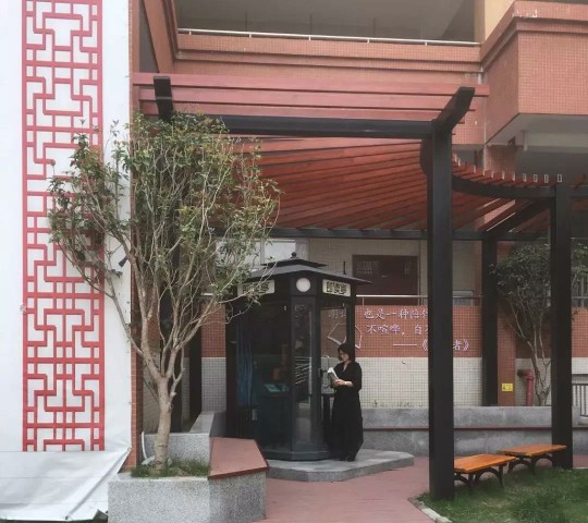 朗讀亭,座落在學(xué)校科學(xué)樓前的東邊草坪邊上,外形似復(fù)古電話亭,溫暖大氣,讓人神往。它占地約2平方米,可謂麻雀雖小五臟俱全——專業(yè)的音響系統(tǒng)、電子屏幕、氛圍燈光一應(yīng)俱全,系統(tǒng)自帶大量的數(shù)字朗讀資源:每學(xué)期必讀書籍中的某些篇章或古詩(shī)詞,語文教材中的某篇課文及節(jié)選,以及教育部推薦的網(wǎng)絡(luò)閱讀平臺(tái)中的中華經(jīng)典等多種類型的書目供選擇。每位朗讀者進(jìn)門后對(duì)著麥克風(fēng)就可以開始朗讀自己心目中的好文章。
