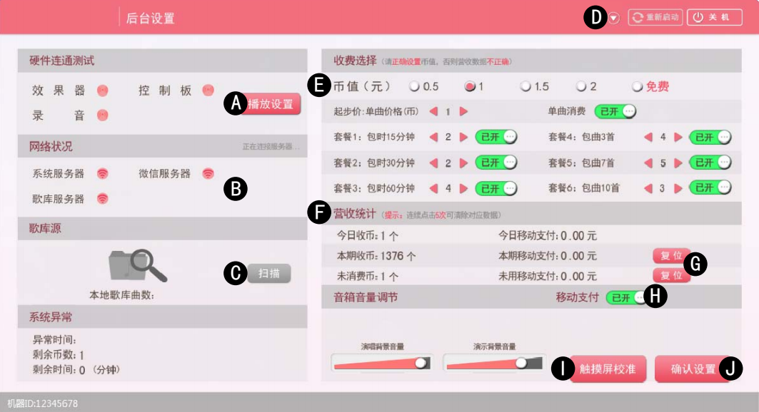 迷你ktv房收費(fèi)多少錢(qián)一首歌設(shè)置_迷你ktv房調(diào)節(jié)音量,可以在通過(guò)按控臺(tái)左上角的“功能”按鍵進(jìn)行操作,3秒內(nèi)按下投幣門(mén)上的“測(cè)試”鍵進(jìn)入;退出時(shí),按觸摸屏上的返回按鈕退出。當(dāng)日營(yíng)收統(tǒng)計(jì)時(shí)間段:6:00AM-(第二天)6:00AM。