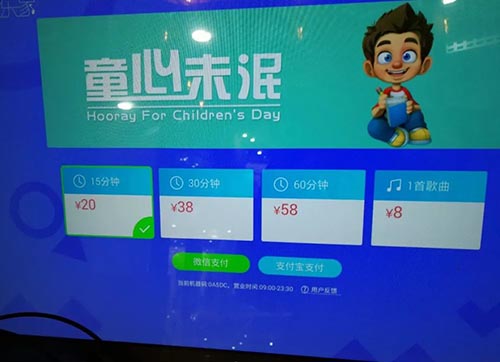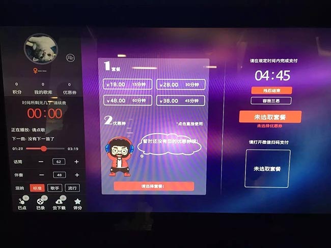 迷你自助ktv唱吧怎么收費?多少錢一小時?掃描二維碼登錄后發(fā)現(xiàn),每臺機器每天有著限定的免費試唱名額,名額用完后,只能試唱更短的時間,如果還想繼續(xù)唱歌就要充值。屏幕上顯示,一首歌曲付費5元,包時15分鐘20元,一小時64元。